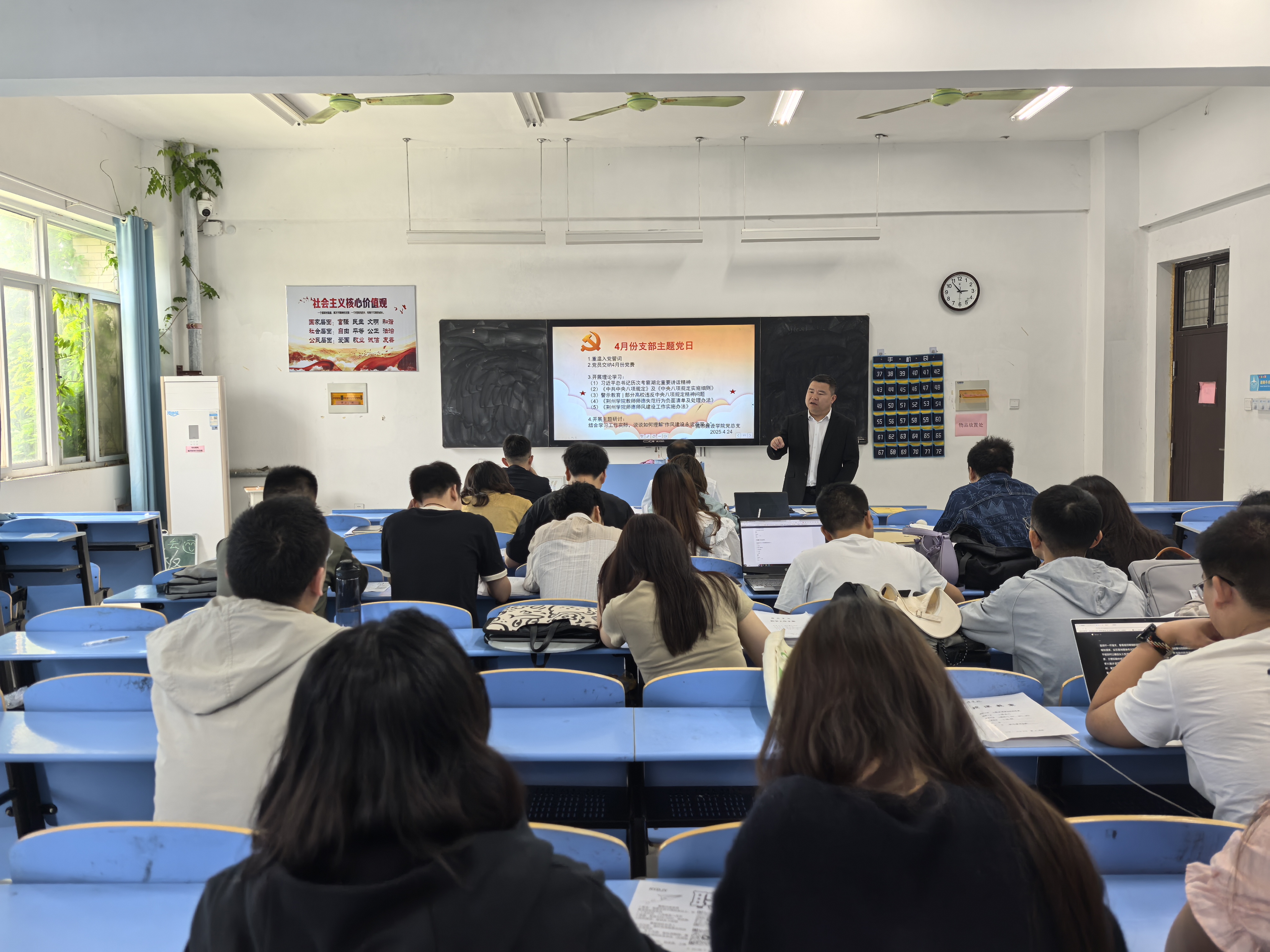 本网讯 在学校党委的精心安排与布置下,城市建设学院于2025年4月24日,在2303教室成功开展了4月份政治理论学习与支部主题党日活动,学院全体党员积极参与,活动取得了良好效果。