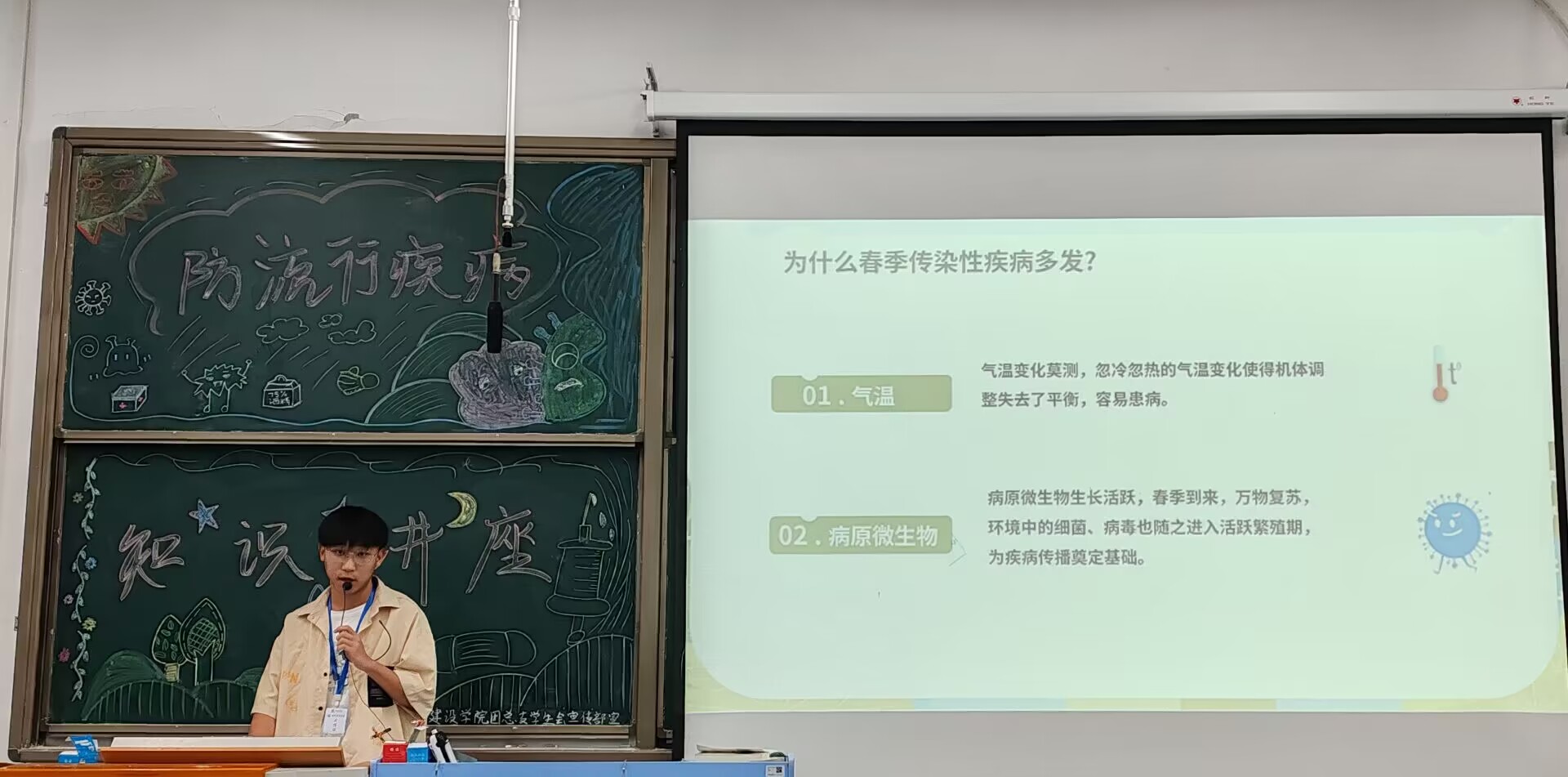 (通讯员 郜志璐)春季万物复苏,气候变化无常,昼夜温差较大,各类致病微生物滋生繁衍,是流行性疾病的高发季节,为保护学生身体健康,预防传染疾病,提高学生预防意识,城市建设学院于2024年4月22日6点半教室在教学楼2301开展防流行疾病知识讲座活动。到场嘉宾有权益部兼纪检部肖秋阳,女生部兼心育部柳朦,学习部覃小宁,本次活动由造价专2303班苏杰同学主讲。