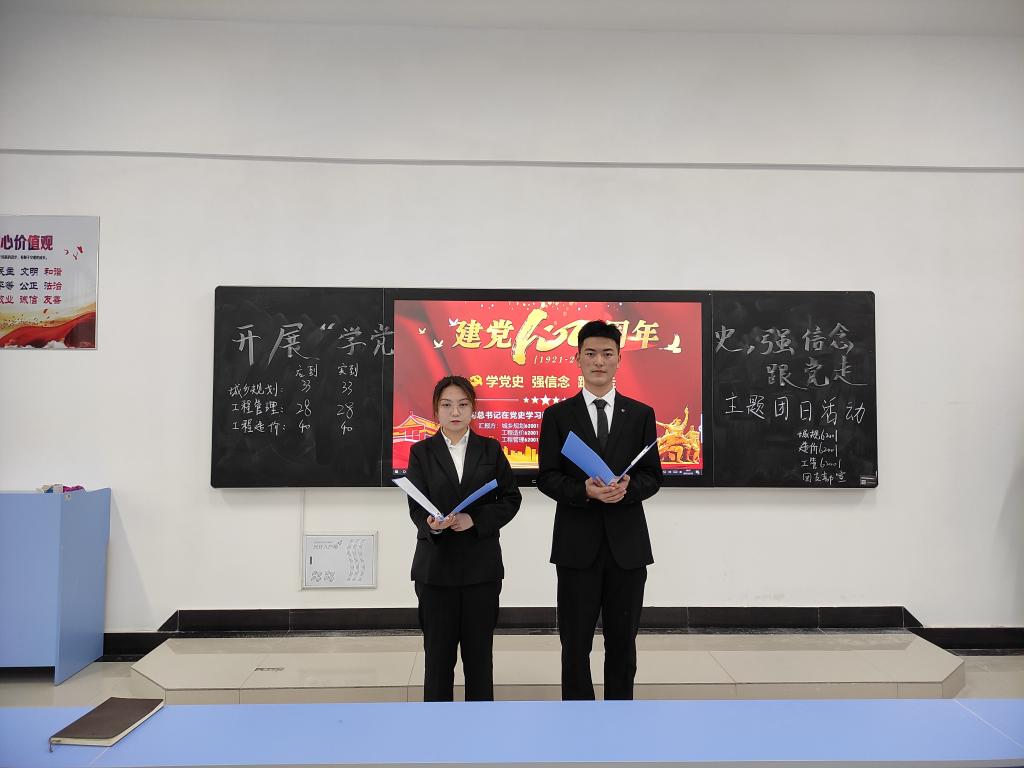 本网讯(通讯员 高勤婷)为了使同学们了解学习党史的重要性,激发广大青年学生的爱国、爱党热情和责任担当,城市建设学院组织开展了“学党史,强信念,跟党走”主题团会。3月19日下午4点,城乡规划62001班、工程造价62001班、工商管理62001班在新校区3403教室共同开展此活动。组织部副部长代梦晴出席活动,活动由原先涛、王佳英主持。