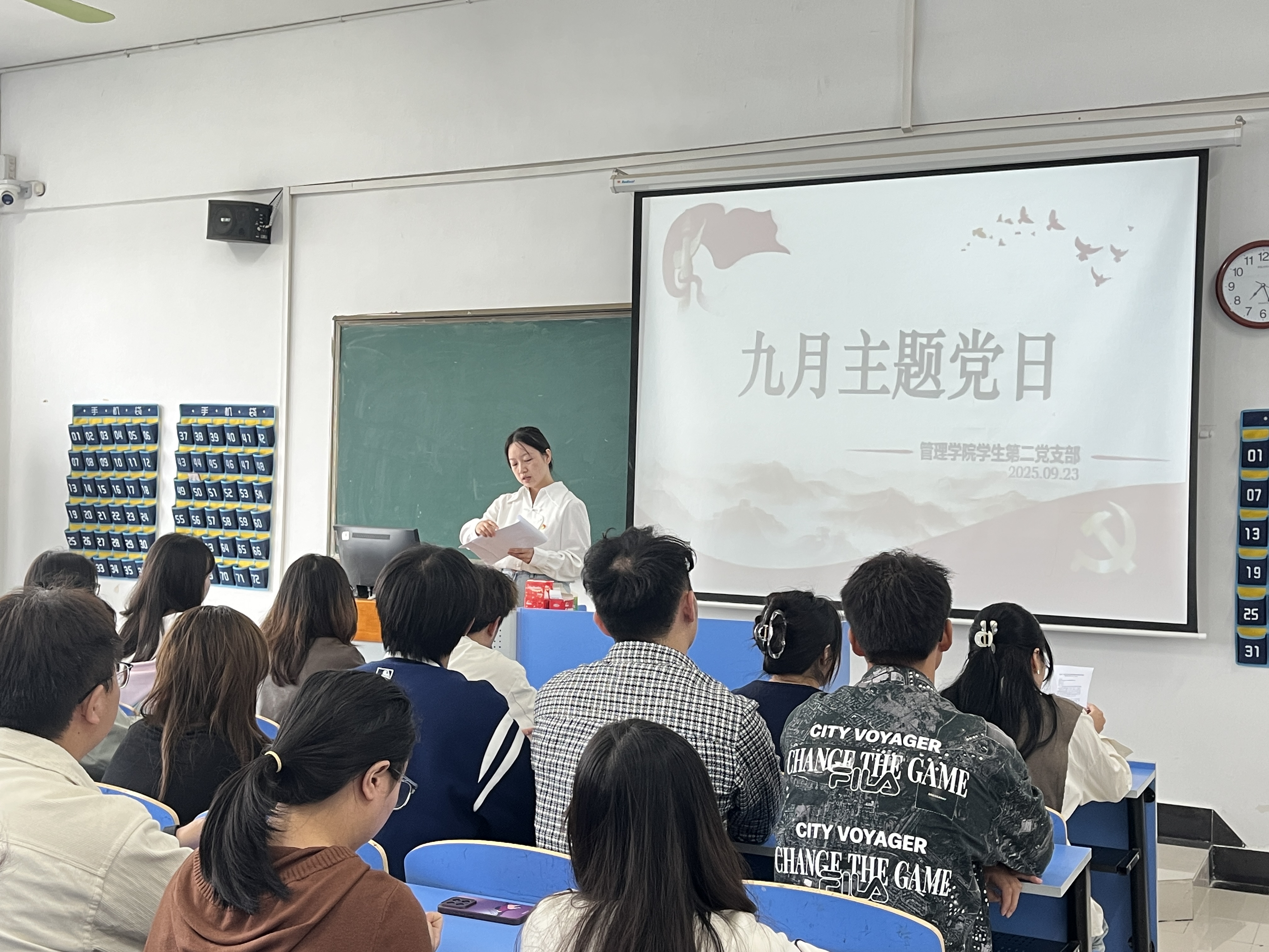 在政治学习后,管理学院第一、第二党支部开展了九月主题党日活动,会上先由党支部书记带领支部成员重温入党誓词、集体朗诵党章并组织党员交纳九月党费。随后党支部书记组织开展理论学习,重点学习了以下内容:(1)习近平:在纪念中国人民抗日战争暨世界反法西斯战争胜利80周年大会上的讲话(2)《求是》杂志发表习近平总书记重要文章《弘扬伟大抗战精神,向着中华民族伟大复兴的光辉彼岸奋勇前进》(3)习近平给全国特岗教师代表的回信(4)习近平作出重要指示强调 锲而不舍落实中央八项规定精神 推进作风建设常态化长效化(5)湖北省委常委会扩大会议暨省委党的建设工作领导小组会议召开 锲而不舍落实中央八项规定精神 推进作风建设常态化长效化。此后,支部开展主题研讨,教职工党员围绕“如何将学习教育成果转化为实干担当的具体成效”、学生党员围绕“传承抗战精神,勇担时代使命,如何在强国建设中彰显青春力量”分别谈认识、讲感悟,结合自身岗位实际与成长需求明确努力方向,切实把学习成效转化为履职尽责、挺膺担当的行动自觉,以实干践行初心使命,以青春力量助力强国建设。