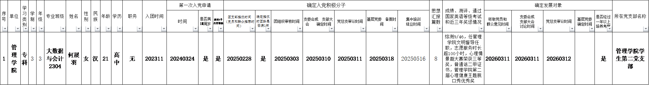 附:拟确定何展羽等1名同志为发展对象基本情况一览表