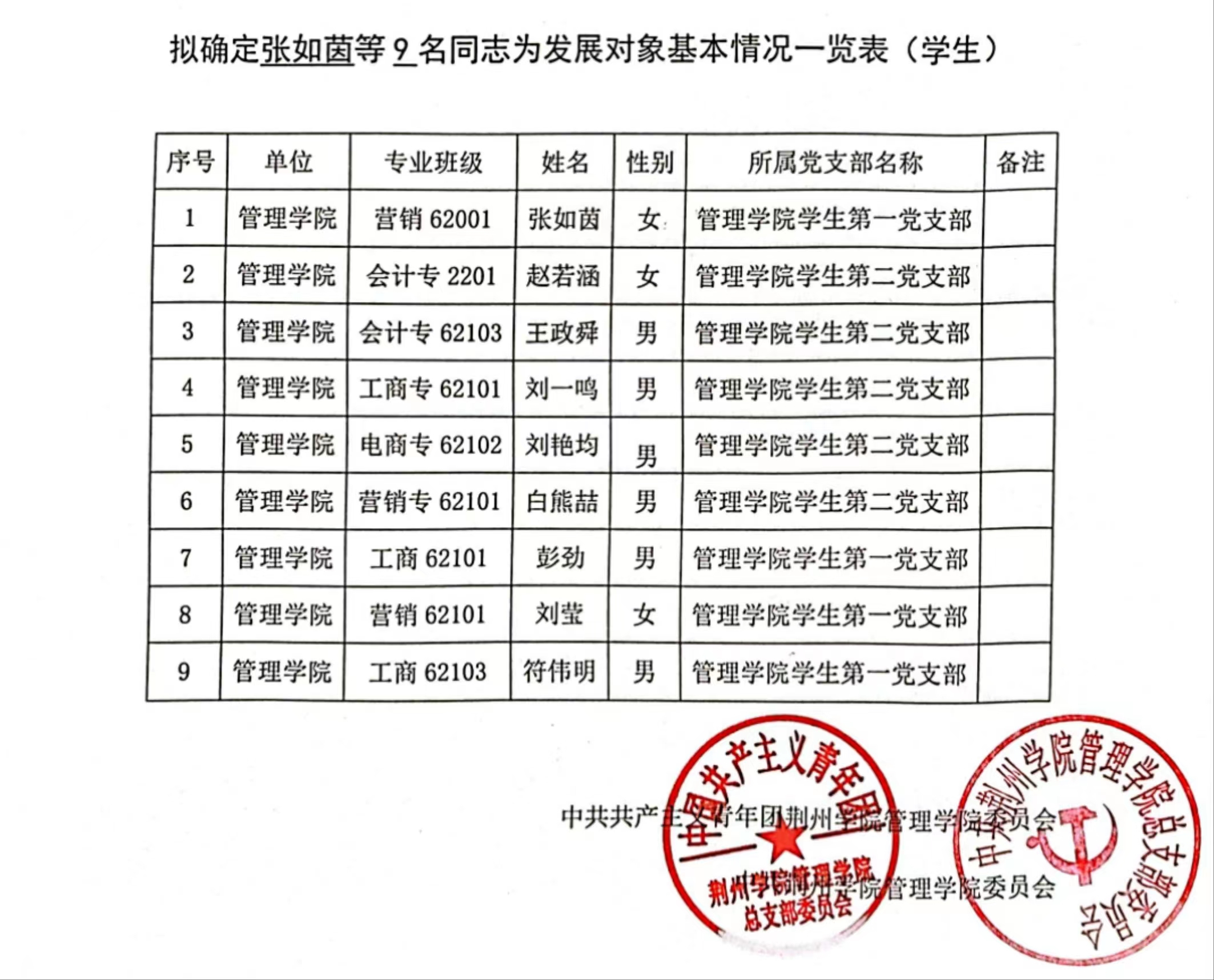 对经过一年以上培养教育和考察、基本具备党员条件的入党积极分子,经听取党小组、培养联系人、党员和群众意见(团员通过团组织推优),支部委员会(不设支部委员会的由支部大会)讨论同意,报党委备案后,拟确定张如茵9名同志为发展对象,特在全院范围内进行公示。