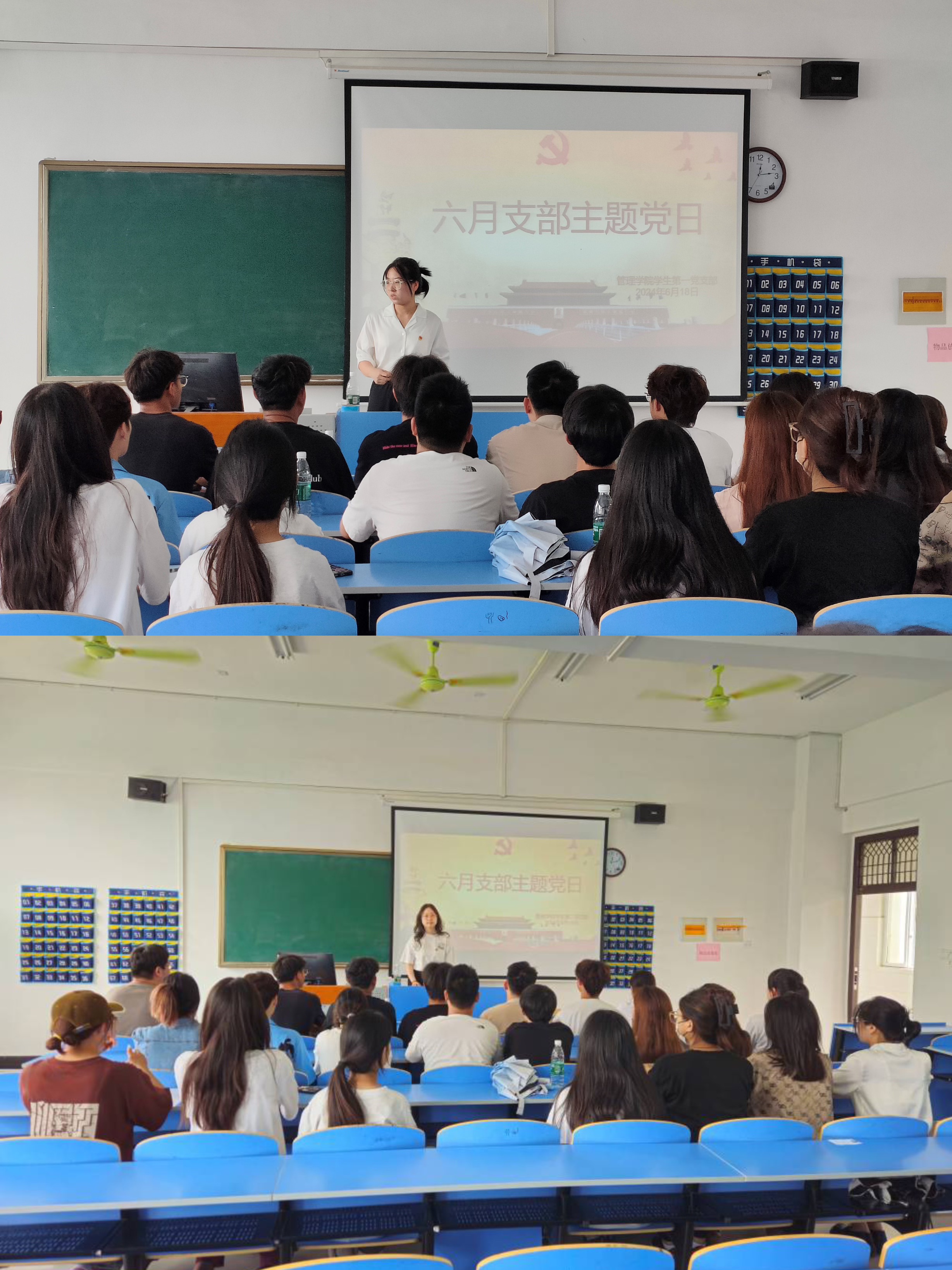 在政治学习后,管理学院学生第一、二党支部开展了六月主题党日活动,会上先由党支部书记带领支部成员重温入党誓词,集体诵读党章并组织党员交纳6月份党费。随后党支部书记组织开展理论学习,重点学习了以下内容:1.《中国共产党纪律处分条例》第8-11章、附则2.习近平总书记关于党的纪律建设的重要论述3.习近平在山东考察时强调 以进一步全面深化改革为动力 奋力谱写中国式现代化山东篇章4.习近平总书记对档案工作作出重要指示批示5.全省领导干部警示教育会举行6.全市领导干部警示教育会举行。此后,支部以“作为一名党员,紧扣‘六项纪律’,结合专题学习内容、纪律党课和个人学习心得”开展主题研讨,组织党纪学习教育,加强党的纪律建设。