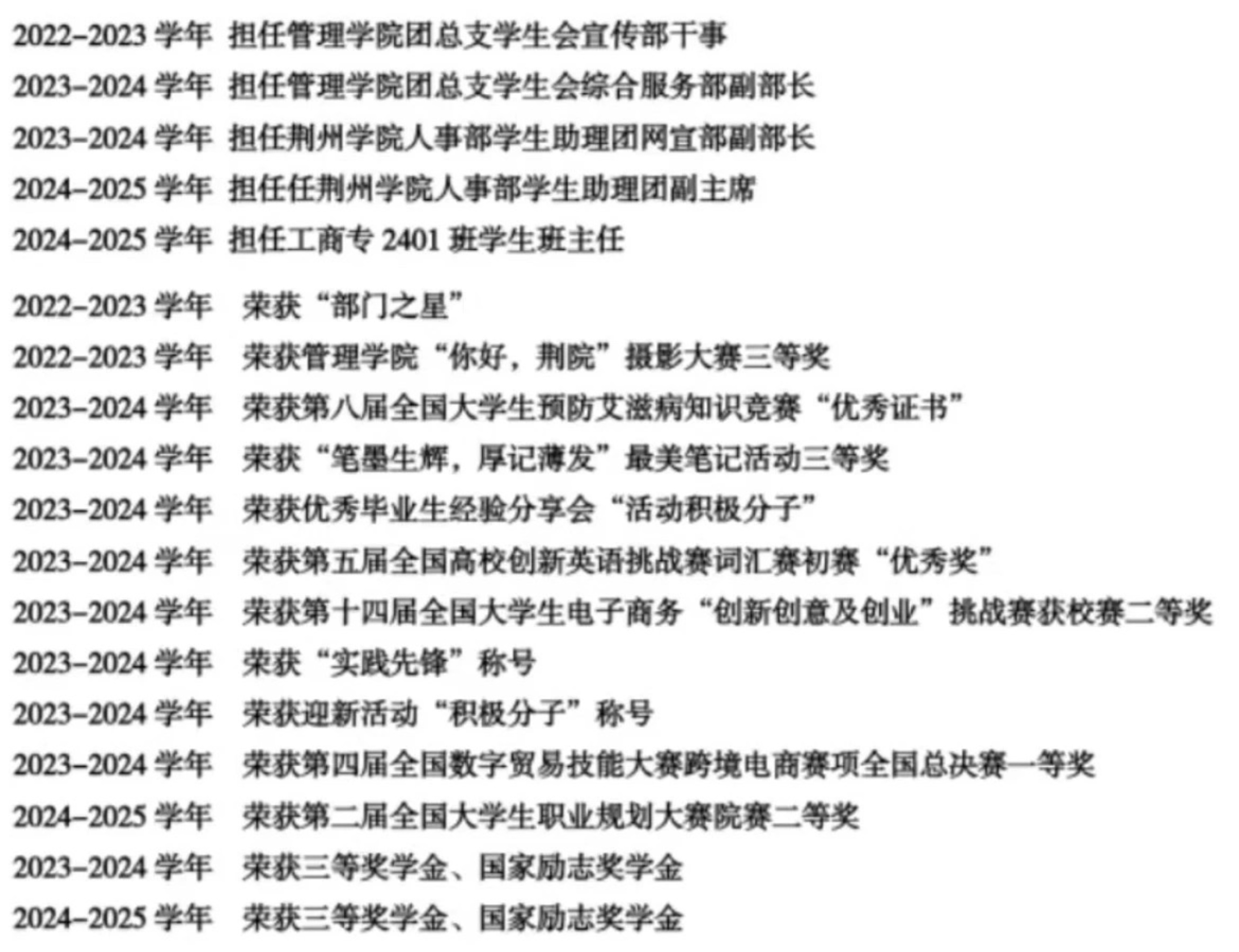 在校学生干部任职情况及在校期间所获得荣誉和奖励: