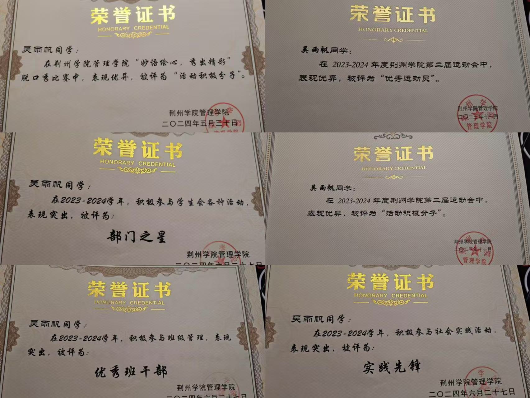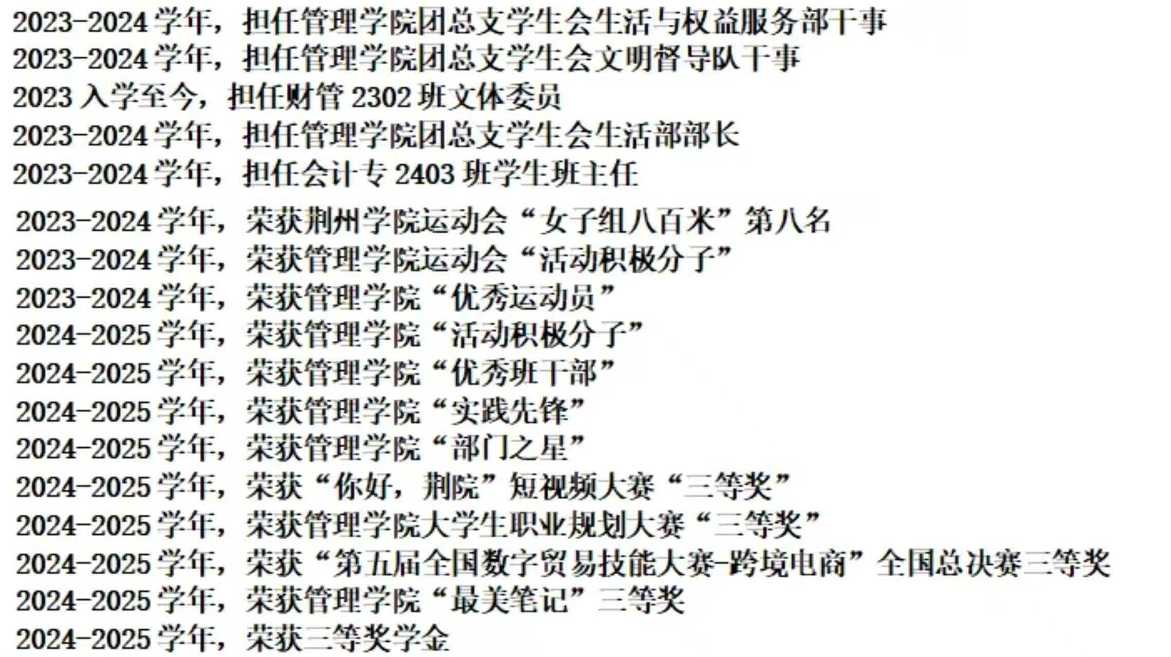 任职履历:曾任管理学院团总支学生会生活与权益服务部干事、文明督导队干事,现任财管2302班文体委员、管理学院团总支学生会生活部部长。