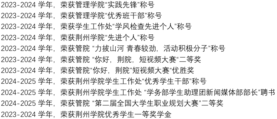 在思想方面,树立了良好的人生观和道德观、与时俱进,积极参加志愿活动。在校园活动中,积极参加学校的演讲比赛、创业大赛、短视频大赛等活动,在管理学院“你好,荆院”短视频大赛中,荣获“二等奖”和“优胜奖”,通过镜头展现了校园的美好和青春的活力。在管理学院“力拔山河,青春较劲”活动中,被评为“活动积极分子”,在“第二届全国大学生职业规划大赛”中荣获二等奖。