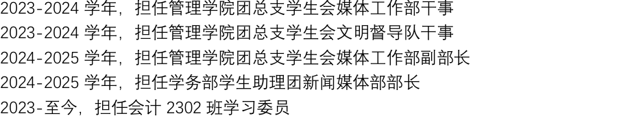 任职履历:曾任管理学院团总支学生会媒体工作部干事、管理学院团总支学生会文明督导队干事,现任会计2302班学习委员、管理学院团总支学生会媒体工作部副部长、学务部学生助理团新闻媒体部部长。
