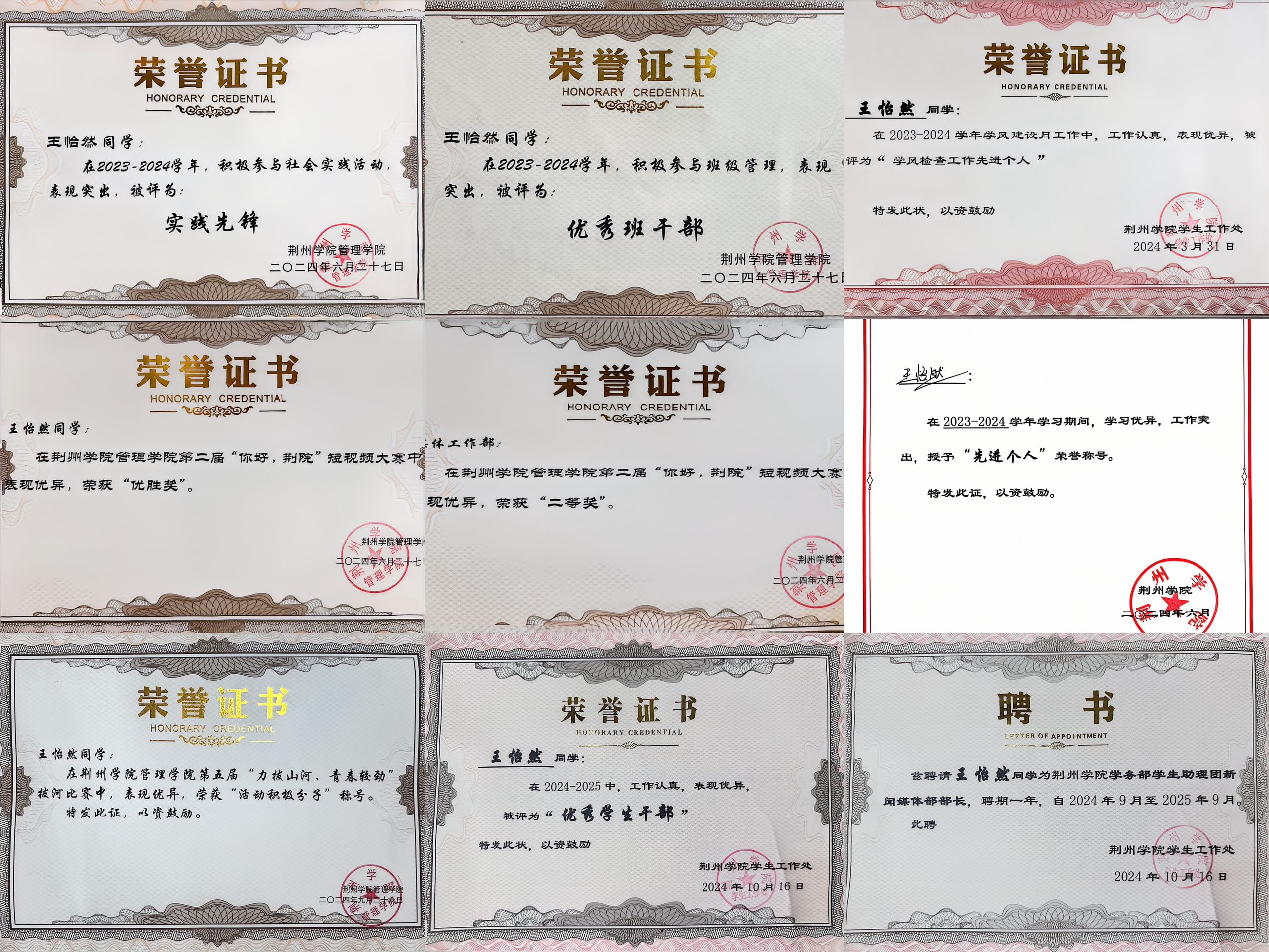 在学习上,在2023-2024学年,综测班级排名第一,荣获2023-2024学年WilliamHill中文官方网站优秀学生一等奖学金。一直坚持学习为学生的第一要务,踏实认真、勤奋刻苦,努力学习专业知识。考取普通话证书,此外还在备战专升本,想要为自己创造更多的学习空间。