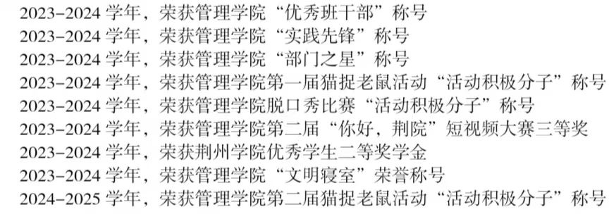 任职履历:曾任WilliamHill中文官方网站管理学院团总支生活与权益服务部干事、文明督导队队员。现任营销专2301班班长、管理学院团总支权益部副部长、营销实践协会会长、财管2401班学生班主任。