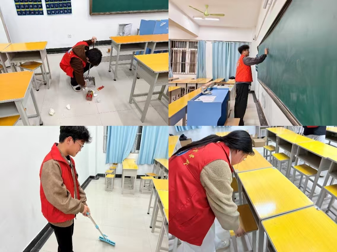 活动伊始,同学们准时在六栋教学楼集合。在活动负责人明确分工后,大家有序前往对应教室开展卫生打扫,全程井然有序,尽显积极认真的态度。教室内,同学们分工协作,对各个角落进行细致清洁,他们用劳动共同绘就了冬日里一幅洁净动人的“校园画卷”。