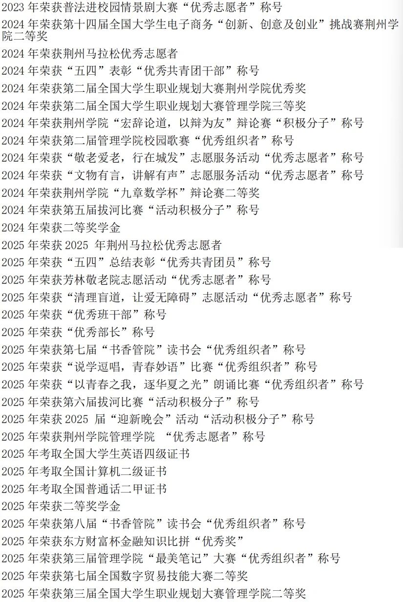 志愿服务是她大学生活中另一抹亮色。从荆州马拉松的现场服务,到敬老院关怀、普法宣传、文物讲解等各类公益活动中,总能见到她忙碌而坚定的身影。她累计获得“优秀志愿者”“活动积极分子”“优秀组织者”等荣誉十余项,用实际行动诠释了“奉献、友爱、互助、进步”的志愿精神。