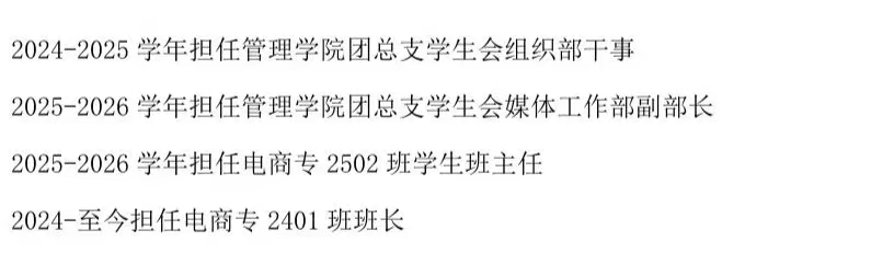 任职履历:曾担任管理学院团总支学生会组织部干事,电商专2401班军训负责人,现任电商专2401班班长、管理学院团总支学生会媒体工作部副部长、电商专2502班学生班主任、管理学院乡村振兴直播志愿服务队队员。