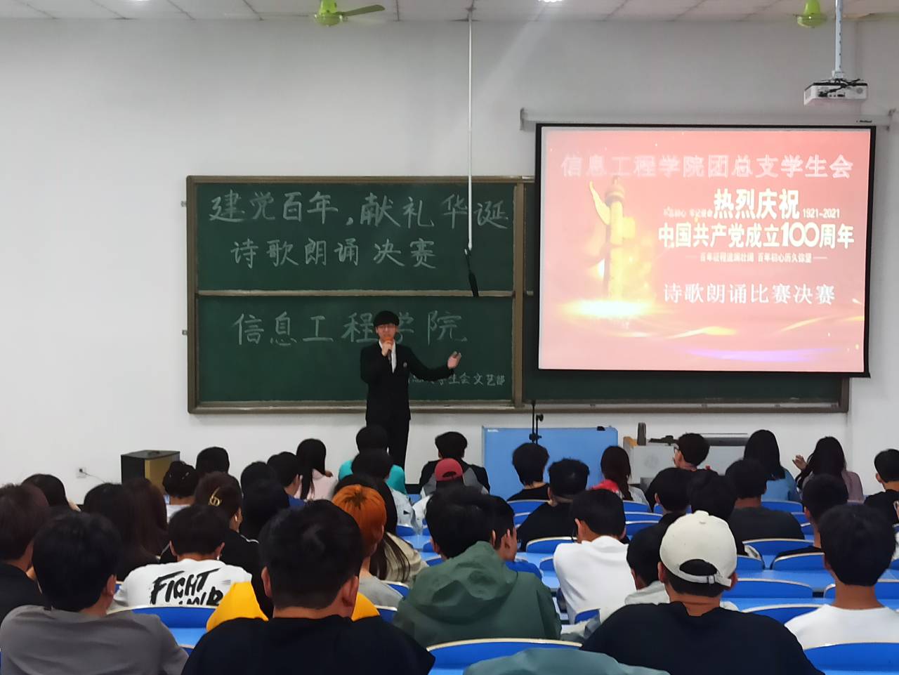 本网讯(通讯员 文雪梅)为深入推进党史学习教育,共庆建党百年,提高大学生的人文素质和道德情操,信息工程学院团总支学生会于4月27日晚上六点半,在教学楼3405举办了“建党百年,献礼华诞”诗歌朗诵比赛决赛。