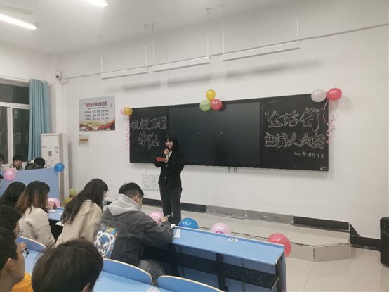 本网讯(通讯员 张国富)为丰富学生们的课余生活,展现当代大学生的风采,选拔优秀的主持人才,2021年11月27日18:30,机械工程学院在教学楼2406举办了“闪亮金话筒”主持人大赛。活动邀请了我院团总支学生会副书记罗思琳,主席江自强,学习部部长宋梦灵,文艺部部长高若敏以及主持团成员邓备出席并担任评委。