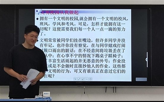 最后学生代表张宇通过展示PPT和相关使同学们明确了校园中的不文明行为,呼吁同学们在生活中讲文明、树新风,创建文明校园,使同学们通过这些视频和幻灯片的展示生动地理解并意识到了在校园生活中应该注意到的问题,也告诫了自己在日常生活中做一个遵纪守法,彬彬有礼的大学生。