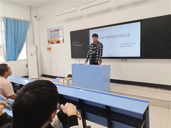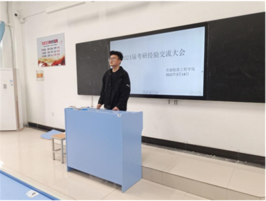 本网讯 2022年3月14日下午,资源勘查工程学院在2505教室组织召开了“2019级本科生考研动员大会”,据悉这是资勘学院“学榜样、树理想”主题教育系列活动的延续,也是2022年第一场主题活动。本次大会由原资源勘查工程学院团支部学生会主席、2018级勘工61801班班长霍少伟同学主持,另邀请了刘先录、龚金祥、陈生华、刘佳康、张庭瑀、周玉钦、高添等7位考研通过国家线,并积极准备复试的同学分享考研经验。