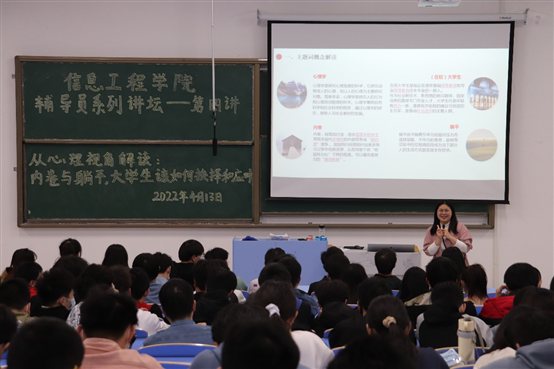 本网讯(学生记者 秦瑞雪)4月13日晚6点30分,我校信息工程学院辅导员韩淼老师在3教405开展了题为“从心理学视角解读:内卷与躺平,大学生该如何抉择和应对”的专题内容讲座。此次讲座是信息工程学院辅导员系列讲坛活动的第四讲,该院2019级学生到会聆听。