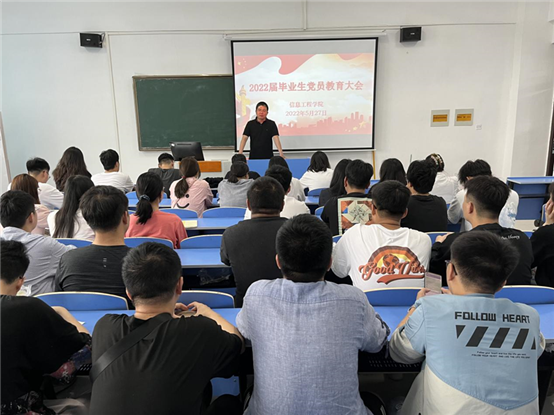 在2022届毕业生党员教育大会上,信息工程学院党总支副书记郭满给毕业生党员上了“不忘初心使命,永葆党员本色”专题党课,对毕业生党员提出四点殷切希望。一是要热爱生活,加强学习、提高综合能力,把在学校学习到的优良品德、生活技能和良好习惯传承下去,勇于追求进步。二是要热爱生命,活出精彩。点燃生命激情,在风雨兼程后感悟人生,把青春和生命绽放在祖国和人民最需要的地方,励志奋斗致远。三是要热爱工作,创出辉煌。热爱自己的工作,爱岗敬业、脚踏实地,努力求真务实。四是要关注母校,牢记身份,铭记誓词,要继续关心关注学校事业发展,不忘党组织和学校的培养和教育,充分发挥党员先锋模范作用,为实现中华民族伟大复兴的中国梦添砖加瓦。