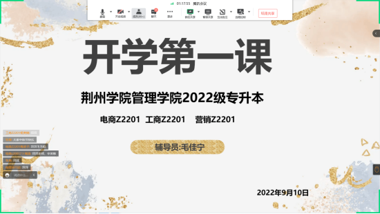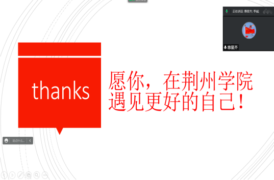 本次线上主题班会围绕融入荆院、学在荆院、赢在荆院及办事指南四个方面展开。各班班代介绍了学院的日常制度,分享了自己刚步入大学时的经验,建议同学们提前做好大学规划与职业规划,明确自己大学期间应该做什么、怎么做,以此不虚度大学的光阴。辅导员老师强调要重视疫情防控,详细介绍了第一周“静默管理”与“七天五检”的相关事宜,增强同学们的自我的防控意识和防护能力,讲解了一周后的日程安排与各方面注意事项。