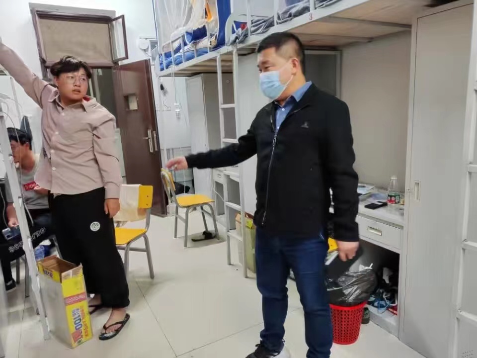 各老师仔细查看了学生宿舍内务整理、卫生安全以及通风消毒等情况,再次向同学们强调疫情防控和宿舍安全的重要性,且就线上教学与同学们进行深入交流。并提醒同学们,要加强防范意识、做好个人防护,疫情期间戴好口罩,按时参加全员核酸检测、不漏一人,时刻保护好自己。老师们鼓励大家,要勤勤恳恳地学习好专业基本知识,切实保证自身作息时间与饮食规律、劳逸结合。同时告诉同学们学校后勤物资保障充足,生活有保障,不必担心。同学们纷纷表示,一定会严格遵守学校各项防疫规定,按时完成每日健康打卡,参加全员核酸检测,不漏一人,携手抗疫。
