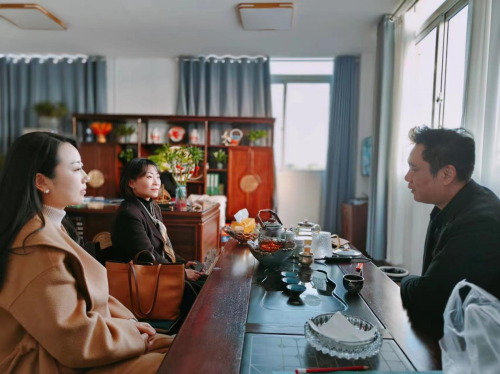在湖北艾慕斯新料料公司,魏院长一行探访了2020级实习生陈金、聂秋英、陈莎,了解日常工作内容,并与该公司徐总就人才培养进行了深入交流。徐总对我院人才培养的质量给予了充分肯定,虽在实习期间,已多次带她们参加国际、国内相关展会。