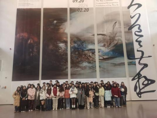 此次考察第一站来到中国美术学院美术馆,同学们参观学习了“大道无极——赵无极百年回顾特展”。本次赵无极百年回顾特展为杭州第19届亚运会重要文化项目、2024中法文化旅游年项目、浙江省文化艺术发展基金重点项目,由中国美术学院美术馆与赵无极基金会联合策划。赵无极是享誉中外的法籍华人著名画家,此次展览是在中国举办的亚洲最大规模赵无极回顾展,是最高规格的赵无极艺术大展,展览分为六大板块,共展出赵无极的油画作品129件,及重要作品和相关文献共200余件,系统梳理了赵无极在不同时期的艺术探索。他深深根植于中国的文化和传统,同时不断向外延伸,通过接纳欧洲和西方传统,建立中西方文化的沟通桥梁,调和差异,让艺术成为生活的核心。