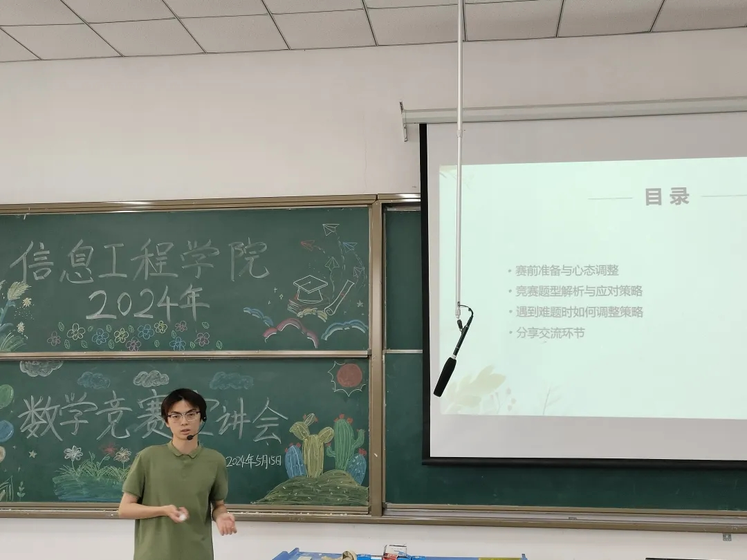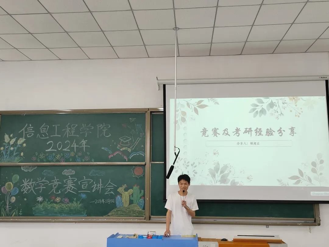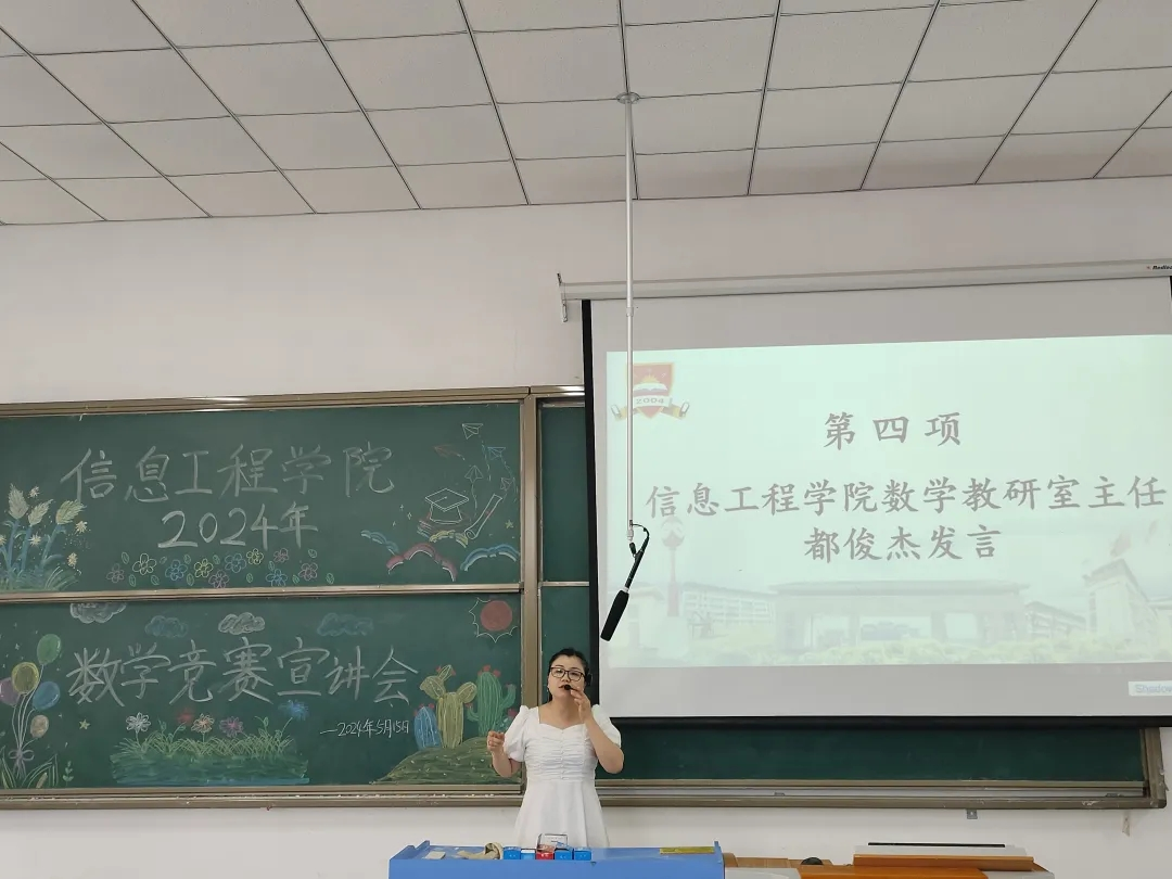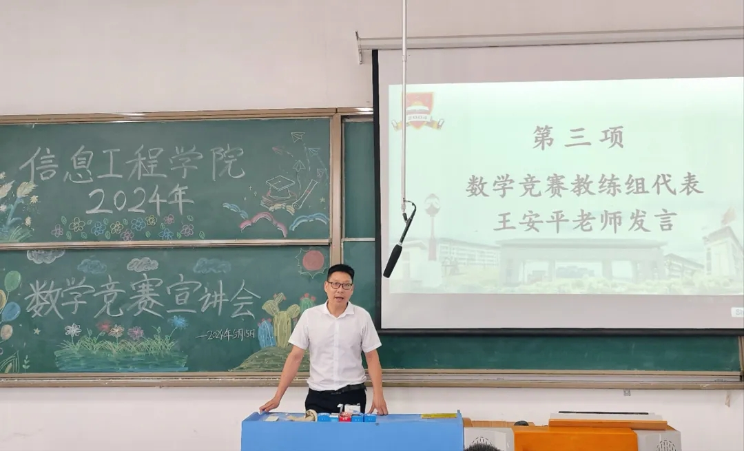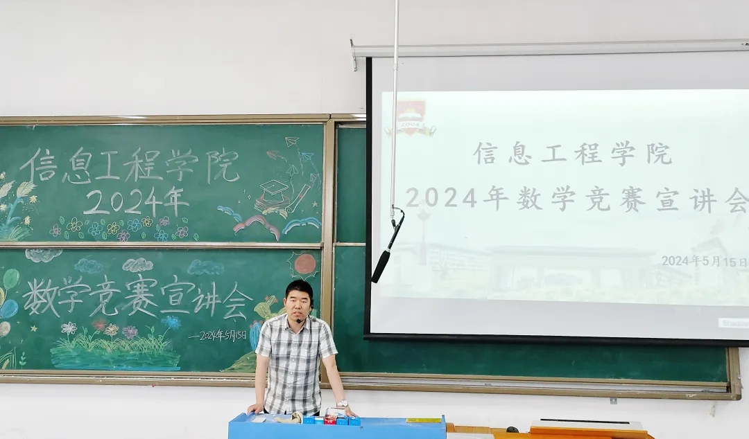 本网讯 为激发学生们对数学竞赛的兴趣,提升学生们的数学素养,培养学生们的逻辑思维,营造良好的学习氛围,信息工程学院于5月15日中午12:30在5205教室召开信息工程学院2024年数学竞赛宣讲会。本次宣讲会由信息工程学院张继成副院长主持,信息工程学院院长杜松江、教研室主任都俊杰、教师代表王安平、赵伟、李程以及各学院学生代表共同参加此次会议。