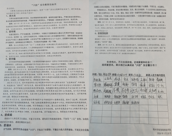 该院全体辅导员组织各班级召开了“六防”安全教育主题班会,主要围绕:防火灾、防车祸、防诈骗、防疾病、防溺水及防借贷陷阱六个方面,逐个举例讲解了预防方法和相关要求,并号召同学们高度重视安全教育,加强自身防范意识。 会后,同学们认真阅读了六防”安全教育告知书,并签字署名。
