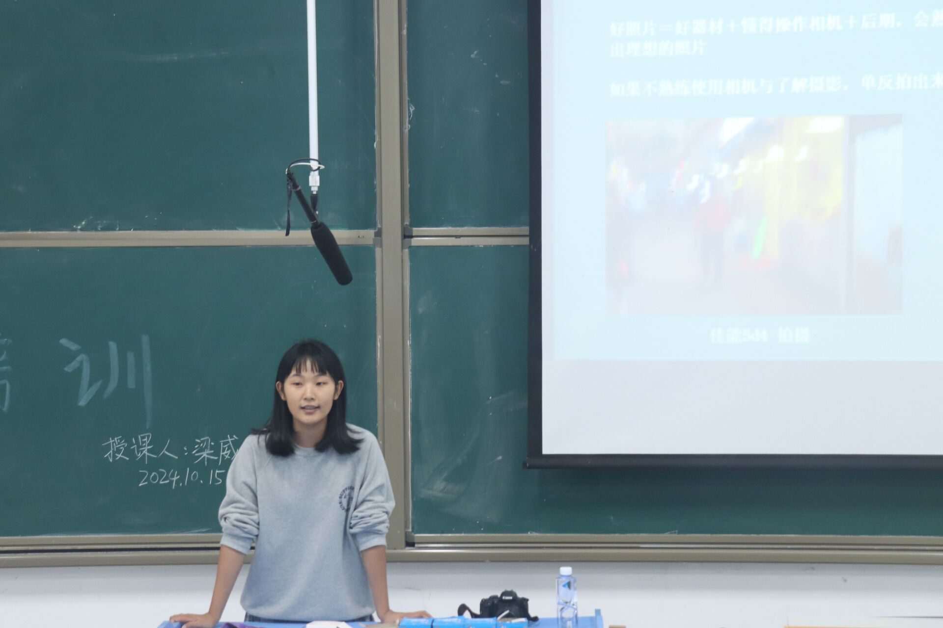 梁威怡结合自身丰富的经验,从相机原理、曝光三要素、如何拍摄新闻图片等方面讲解了摄影基础知识。首先,梁老师详细介绍了相机的原理与基本功能,让新成员们对摄影设备有了初步的认识。对于曝光的三要素——光圈、快门与感光度,她通过丰富的照片案例帮助大家理解如何根据不同的拍摄场景与需求进行合理的配置。此外,针对如何拍摄新闻照片这一核心问题,梁老师分享了许多实用技巧和注意事项,新成员们在培训过程中认真聆听、积极提问。