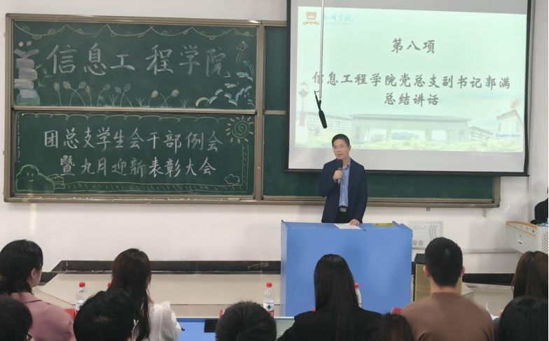 随后,信息工程学院团总支书记李程发表致辞,她高度肯定了全体成员在迎新工作中团结协作、无私奉献的精神风貌,并鼓励全体成员继续发扬优良传统,为学院发展贡献青春力量。最后,信息工程学院党总支副书记郭满对会议进行总结,他表示希望同学们能够继续发扬“团结、勤奋、求实、创新”的精神,以身作则,带领广大同学共同进步,为学院的发展贡献更多智慧和力量。