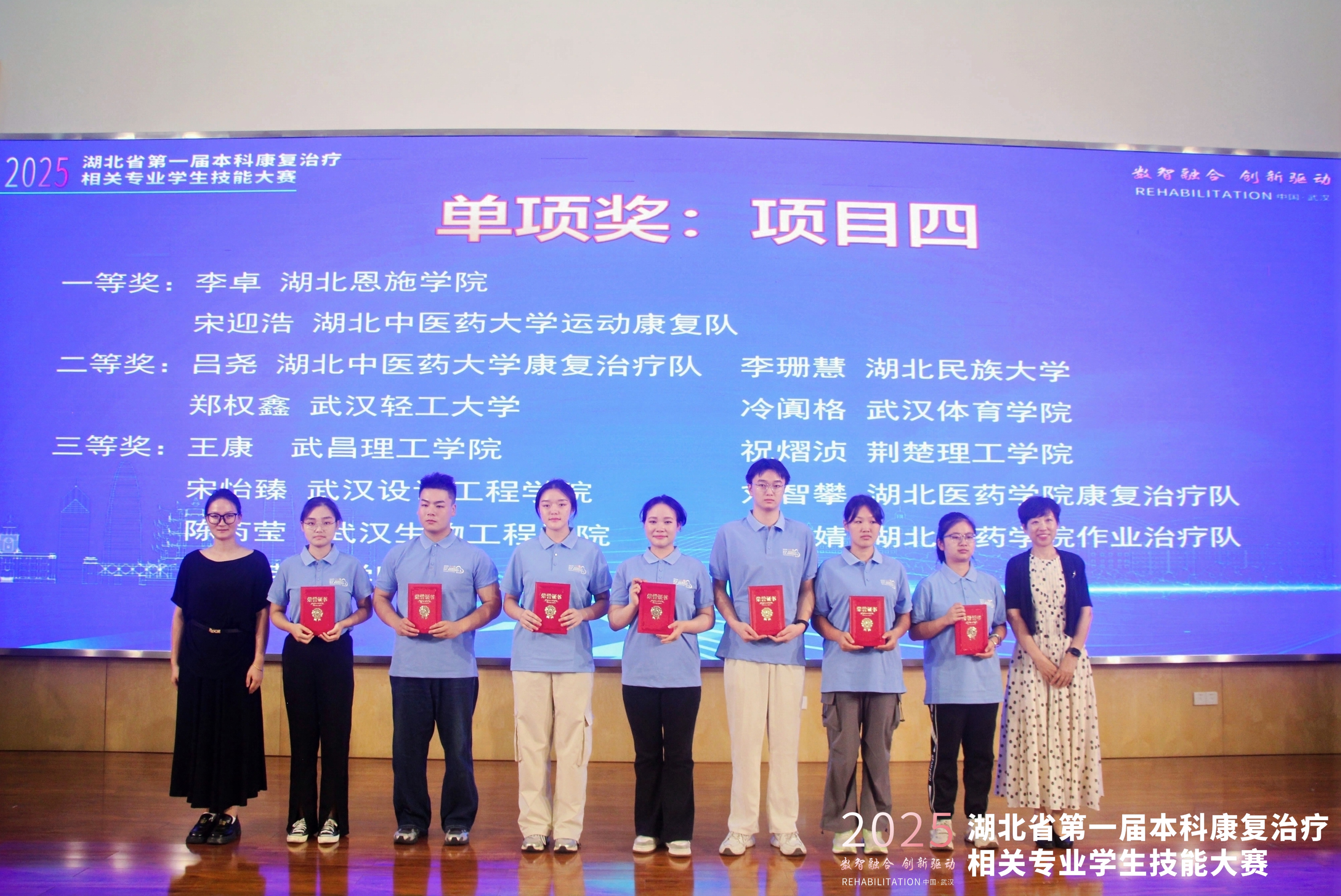 本次大赛由湖北省康复医学会康复教育专业委员会主办,来自全省多所高校参加比赛,致力于提升康复治疗学专业学生的实践操作能力和专业素养,激发学生对专业技能的学习热情,增强学生就业竞争力。大赛采用团队赛制,由线上虚拟赛项和虚实结合线下操作赛项(康复问诊、康复评定、康复治疗)两部分内容组成。