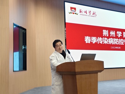 本网讯 春日回暖,传染病进入高发期。为切实筑牢校园公共卫生安全防线,提升师生传染病防控意识与自我防护能力,3月23日下午,由学务部、总务部联合主办,健康医学院承办的春季传染病防控专题讲座在学术报告厅举行。荆州区太湖卫生院副院长李军、公卫科长陈燕芬、公卫医生周莹、住院部医生蔡子奥,健康医学院刘玲华教授、党总支副书记李泽瞳、膳食服务中心主任雷云枫出席讲座,各二级学院学生代表到场聆听。