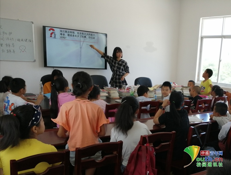 图为董秋莲老师正在给孩子们上如何敬老爱老的心理健康教育课,培养孩子们的孝心。中国青年网通讯员 乔丹 摄