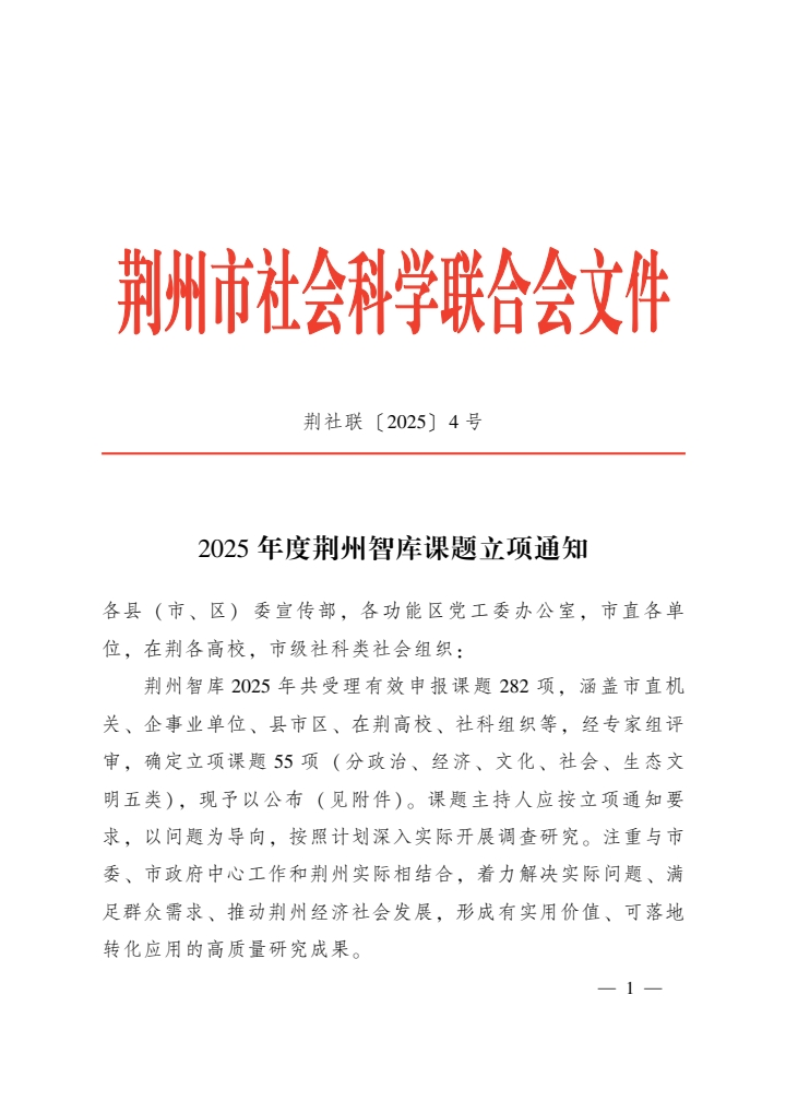 近日,荆州市社会科学联合会发布《2025年度荆州智库课题立项通知》(荆社联〔2025〕4号),我校城市建设学院魏科丰老师和马克思主义学院司翔老师主持的课题成功获批立项。