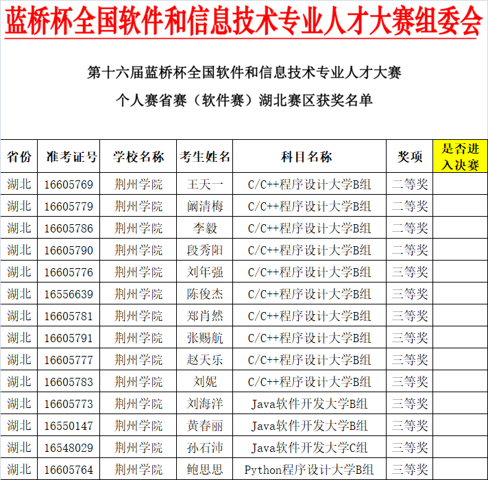 此次大赛成绩再次刷新了我校蓝桥杯获奖记录,为学校在电子信息技术领域的发展成就再添浓墨重彩的一笔。既是对学校长期以来对学科建设和人才培养的充分肯定,也将激励更多学子积极投身于专业学习和实践创新中。在未来的日子里,信息工程学院将继续完善参赛学生选拔方案,优化赛前辅导方式,秉持我校优良的办学传统,不断深化教育教学改革,培养更多高素质、创新型的信息技术专业人才,在各类赛事和行业领域中再创佳绩,为学校的发展和学生的进步做出新的更大贡献!
