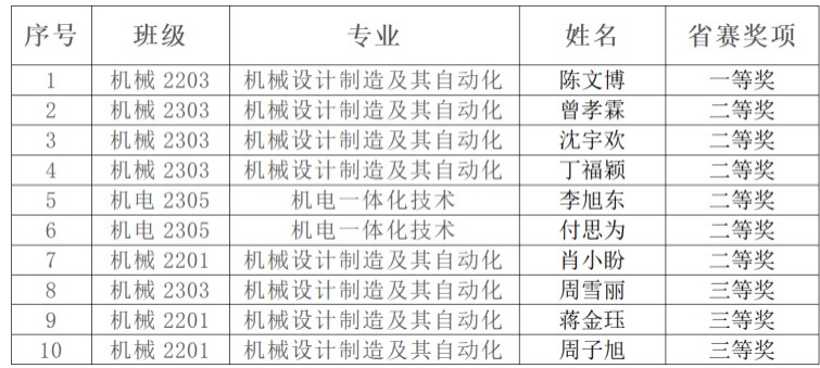 先进成图技术机械类竞赛设先进成图、增材制造、数字化创新设计、轻量化与AI应用四大赛道,全面考察参赛选手在机械制图、3D打印、创新设计及结构优化等方面的综合能力。我校由智能制造学院院长眭满仓带队,胡飞、舒锐、樊甜甜、雷朱坦等教师组成指导团队,赛前对参赛选手开展了专项集训,有针对性地提升学生实践技能。通过省赛的激烈角逐,我校陈文博同学获机械类个人赛道一等奖,曾孝霖等6人获得机械类个人赛道二等奖,周雪丽等3人获机械类个人赛道三等奖(具体获奖情况见下表)。