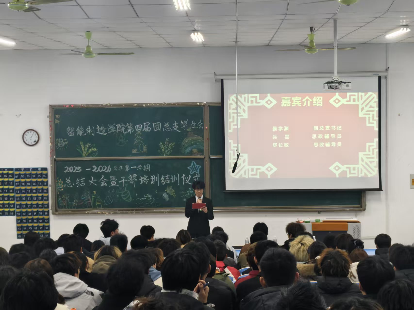 本网讯(通讯员 温雨鑫)12月25日晚,智能制造学院团总支学生会2025-2026学年第一学期总结大会暨学生干部培训结训仪式在教学楼5205教室隆重举行。学院团总支书记晏学渊及辅导员吴昙、舒长敏出席活动。会议由副主席张子健主持,全体学生会成员参会,共同回顾学期工作成果,展望未来发展蓝图。
