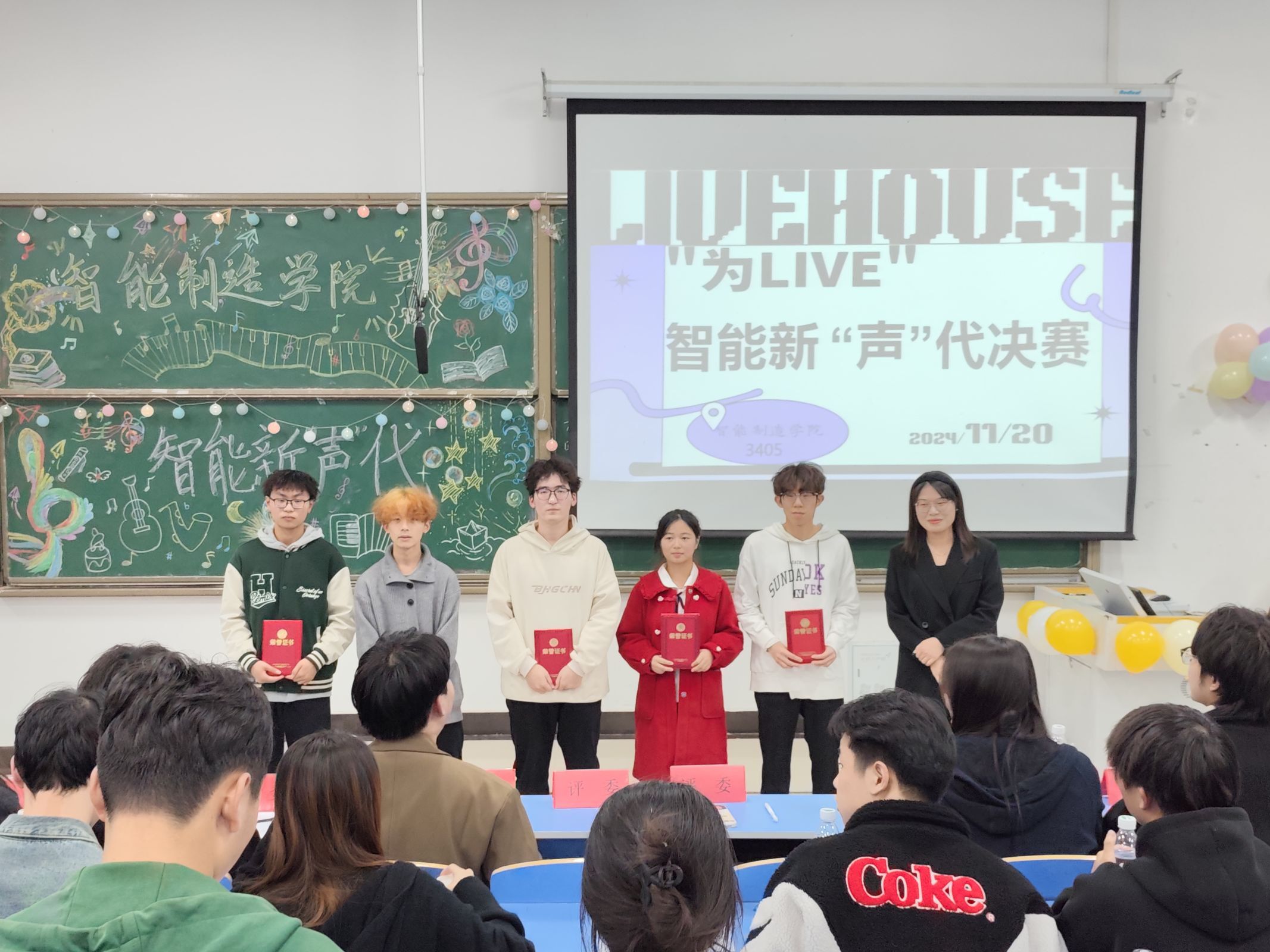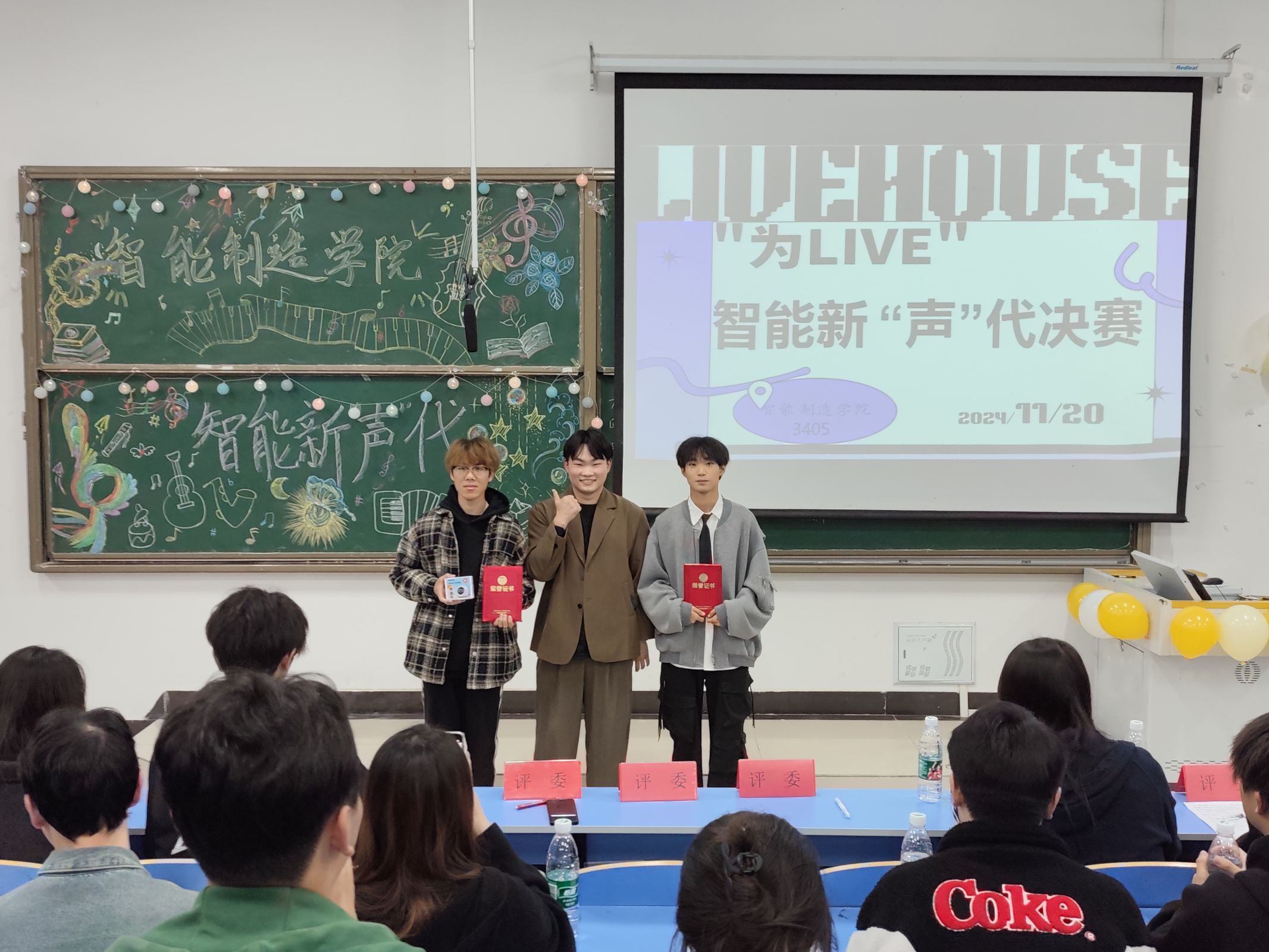本网讯(通讯员 桂秉盛)“此曲只应天上有,人间能得几回闻。”为我院同学提供一个展示自我,交流学习的平台,促进校园文化建设,营造积极向上的校园文化氛围,11月20日晚6:30,我院在3405教室举办了智能新‘声’代歌唱比赛决赛。党总支书记王艳,党支部书记雷倩及全体辅导员作为嘉宾出席本次活动,团总支书记晏学渊,思政辅导员吴昙、柯婷,校学生会文体部部长吕庚,艺术团主席方博,教育学院学生会主席朱颖,艺术团声乐部部长豆文怡,艺术团说唱部副部长郭梦如担任本次大赛评委,智能制造学院全体学生共同参与,本次大赛由万荣鑫、张昕媛主持。