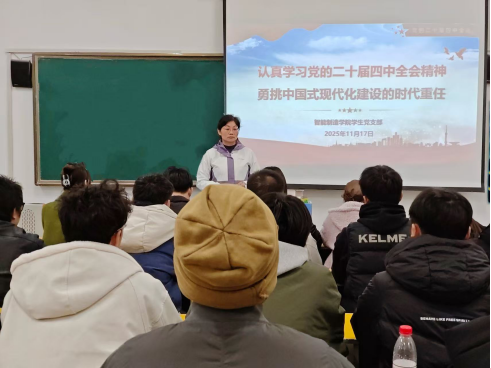 为深入学习贯彻党的二十届四中全会精神,引导青年学生党员深刻把握“十五五”时期发展要求,将个人成长融入中国式现代化建设大局,2025年11月17日,智能制造学院党总支书记王艳以“认真学习党的二十届四中全会精神,勇挑中国式现代化建设的时代重任”为主题,面向全院学生党员讲授专题党课。全体学生党员、入党积极分子代表参加学习。