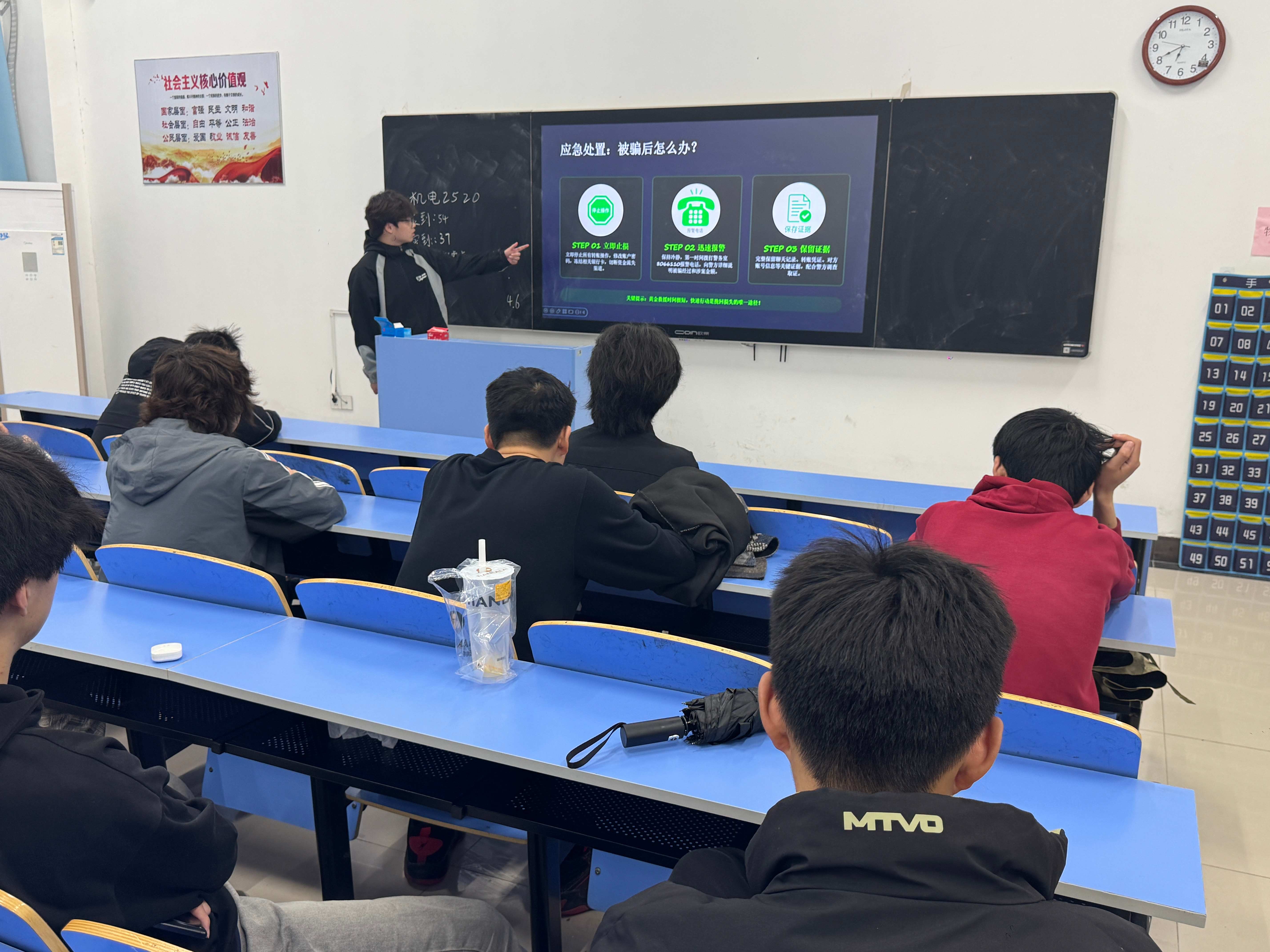 反诈教育环节,辅导员逐一剖析大学生高发诈骗类型的作案手法与防范要点,强调刷单返利均为诈骗、正规客服绝不索要验证码、非法校园贷危害巨大等核心常识,引导同学们牢记不轻信、不透露、不转账、多核实的“三不一多”反诈原则。同时,明确被骗后立即止损、保留证据、第一时间联系辅导员的应急处置流程,提升学生自救能力。