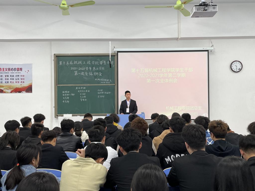 本网讯(通讯员 杜盈 张健)新学期,新开始,为激发学生干部的工作积极性,确保我院2021年的学生工作稳步发展,机械工程学院于3月16日晚19:00,在新校区2201教室召开了新学期第一次全体学生干部例会,该院党总支副书记王艳、团总支书记苏杭老师出席了本次会议,团总支学生会全体成员参加了会议。