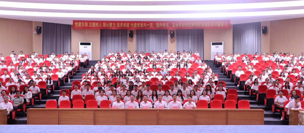 校长戴国强在大会上发表重要讲话。他首先代表学校向全体教职员工致以节日的问候和崇高敬意,向受表彰的先进单位和优秀个人表示祝贺。总结了我校过去一年教育教学管理工作取得的成绩,他指出:“教师是立校之本、兴校之源”,学校取得的各项成绩凝结着每位教职员工的心血与汗水。最后他向全体教职员工提出四点希望:一是筑牢信仰之基,做学生成长的“引路者”;二是锤炼教学本领,做学识扎实的“授业者”;三是涵养师德师风,做修身立德的“示范者”;四是主动担当作为,做学校发展的“建设者”。