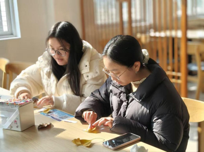 活动准备了大量经过前期收集与处理的银杏叶,辅以各类干花及手工工具。长桌上材料分类整齐,同学们或独立构思,或协作创作,通过拼贴、层叠等手法,将片片落叶转化为书签、相框等作品。有的勾勒校园建筑轮廓,有的拼出秋日风景,还有的写上暖心寄语,让落叶焕发出新的情感意蕴。