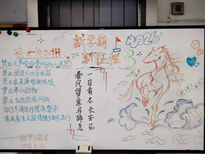 整期板报将马年元素、新学期祝愿与住宿提示有机融合,造型生动、内容实用,兼具观赏性与教育意义,为新学期营造了温暖、文明、安全的校园氛围。