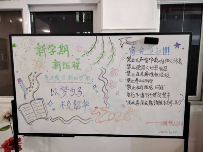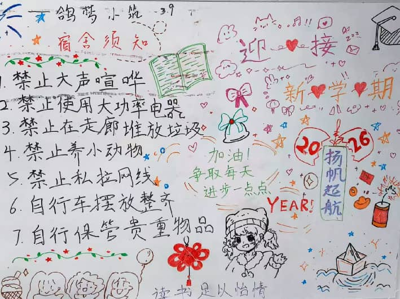 (通讯员 杨明到)为迎接2026年春季新学期,营造昂扬向上、温馨和谐的校园氛围,传递文明住宿理念与新学期美好期许,3月9日,在学务部宿舍管理中心指导下,学生组织“鸽梦小筑”以趣味手绘形式开展“新学期·新征程”主题板报更新工作,通过富有创意与温度的视觉表达,为同学们送上新学期的祝福与提醒。