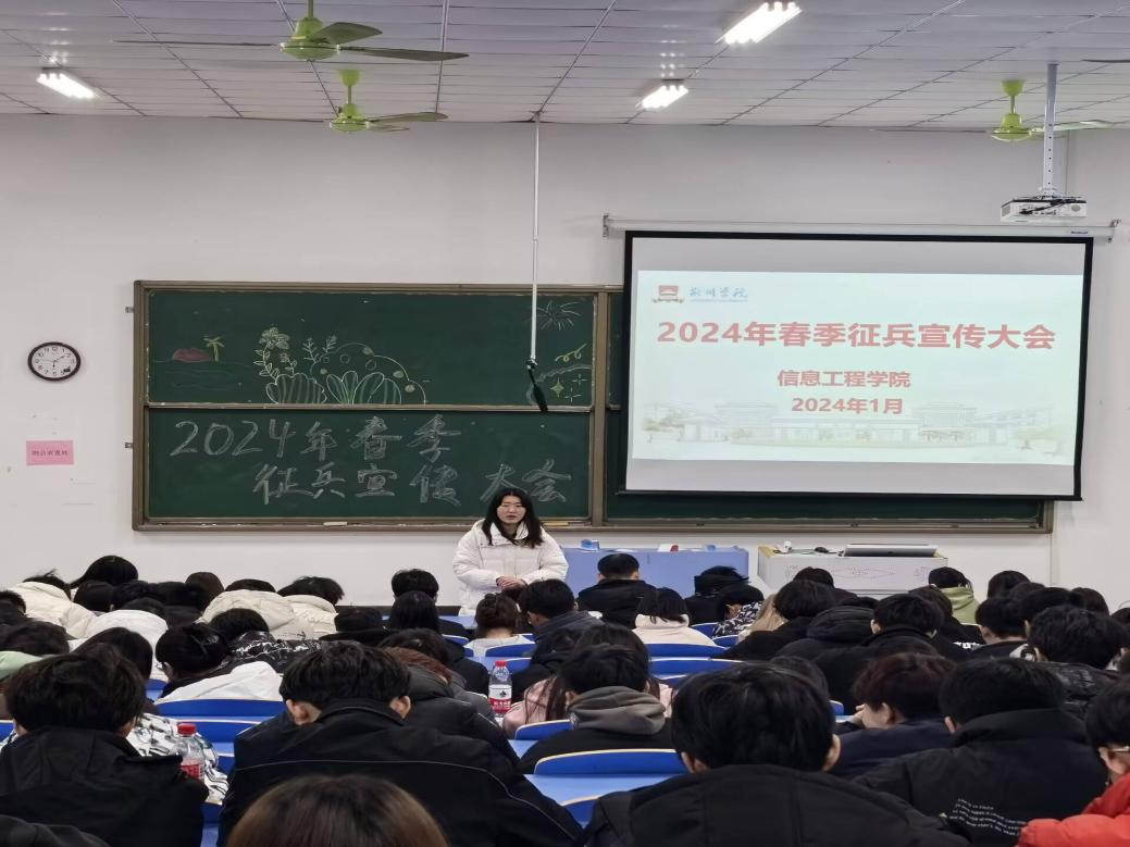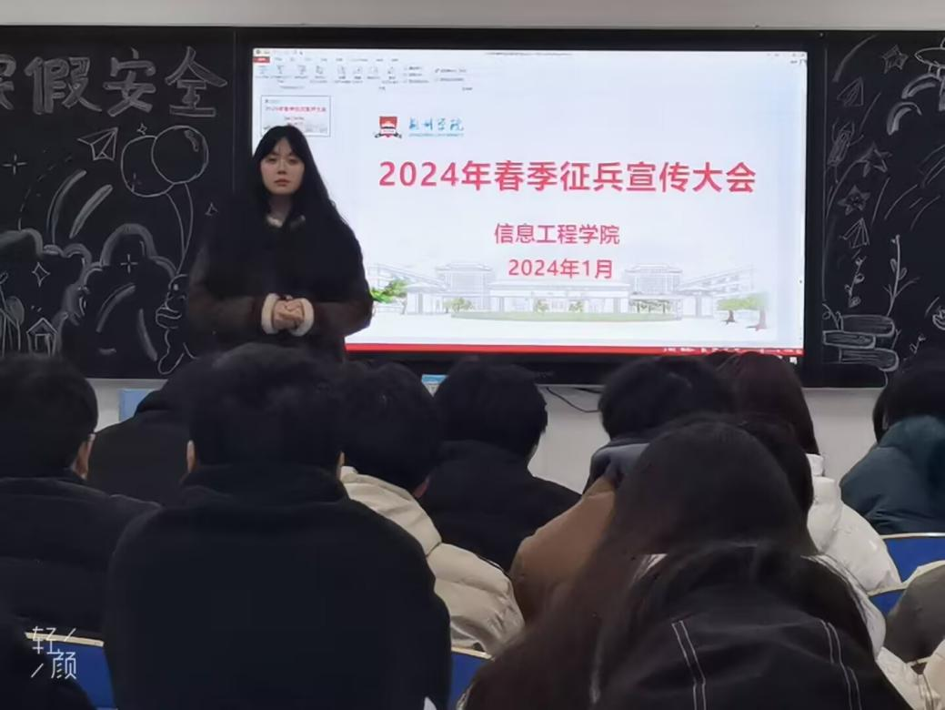 国防强则国家胜,军队勇则民族兴。为响应国家征兵政策,扎实做好征兵工作,积极动员大学生踊跃报名参军,信息工程学院于1月3日在6505教室开展了2024年春季征兵宣传大会,辅导员牛家鑫、罗艳丽、薛楚雄分别开展了入伍宣传大会。