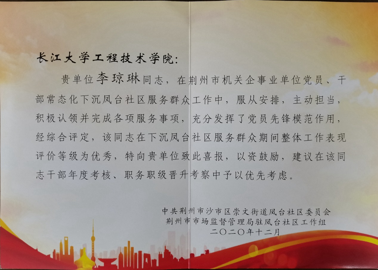 本网讯(记者 黄思琦)近日,我院基础教学部李琼琳老师因在党员下沉社区表现优异,沙市区崇文街道凤台社区经综合其整体工作表现评定为优秀等级,特向我院发来喜报。