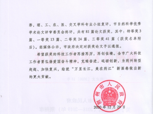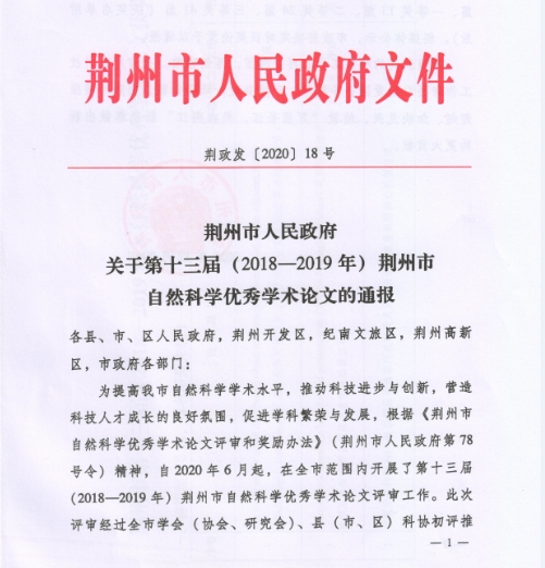 【科研动态】陈希湘老师论文荣获荆州市第十三届自然科学优秀学术论文一等奖