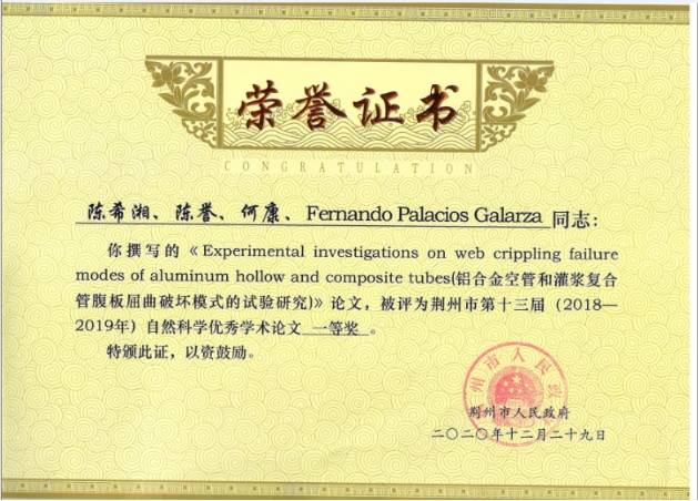 本网讯 近日,从荆州市科学技术协会获悉,我院信息工程学院陈希湘老师的论文《Experimental investigations on web crippling failure modes of aluminum hollow and composite tubes》获荆州市第十三届自然科学优秀学术论文一等奖。