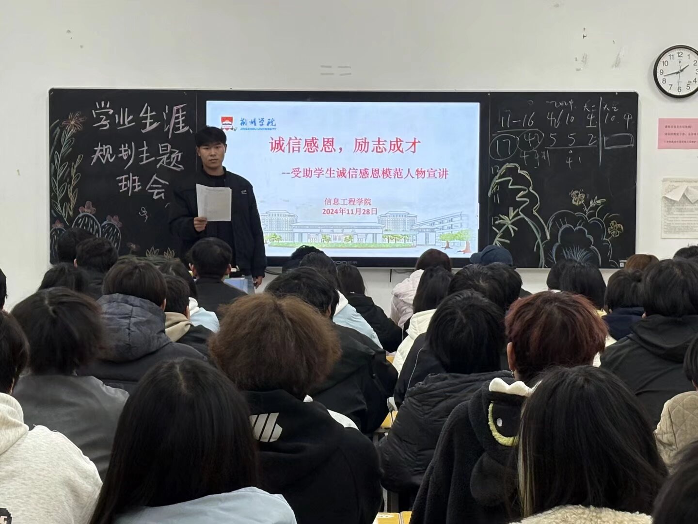 为深入贯彻落实立德树人根本任务,进一步加强学生资助政策宣传力度,切实提升资助育人实效,引导学生树立诚信意识、常怀感恩之心,11 月 20 日,信息工程学院组织各年级班级全面开展诚信感恩教育主题班会,让诚信之风浸润校园,让感恩之情温暖人心。